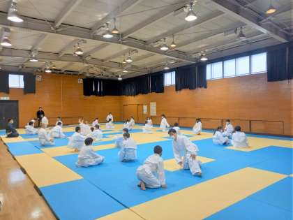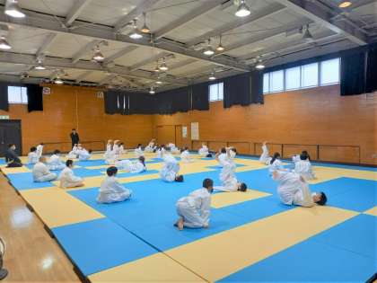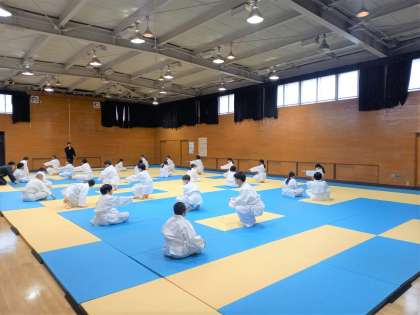 1年生の体育は、クラスごとに柔道とダンスを行っています。受け身の後、ペアごとに相手へアドバイスをしています。