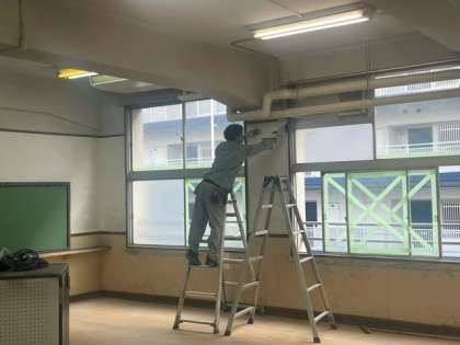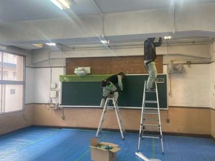 今日から営繕事務所と合同作業で3年生が使用していた教室を塗装してもらいます。