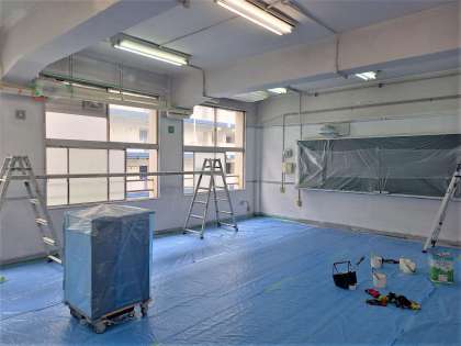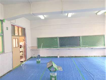 卒業した3年生の教室の壁面を塗装し直しています。営繕事務所の管理作業員さんが、入学式に間に合わせるため、急ピッチで進めています。