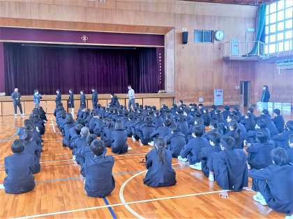 4時間目、2年生は体育館で学年集会を行いました。「皆勤賞」「多読賞」の表彰のあと、春休みの生活について学年の先生方からお話がありました。写真は「多読賞」の表彰の様子です。
