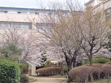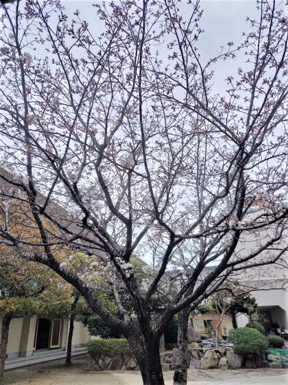 今朝方まで降り続けた雨も朝にはやみました。中庭の桜はまだ5分咲き。暖かな春の日が続くと桜も満開に近づきます。