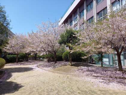 中庭の桜も散り始め、木の周りはピンクのじゅうたんのようです。