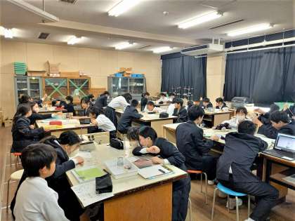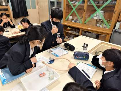 1年生の理科の授業の様子です。スポイトで決められた分量の水を取り、メスシリンダーに移し替えています。