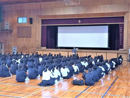 入学して1週間がたち、正門を通る1年生の顔も中学生らしくしっかりしてきたように思います。毎週水曜日は、1年生学年集会です。学年主任の先生からは、クラスのいる違う小学校の人にも積極的に声をかけて仲良くなっていきましょうとお話がありました。