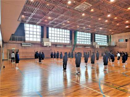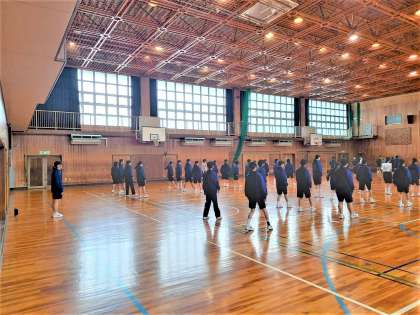 2年生体育の様子です。男女とも号令に合わせて、「右向け右」や「回れ右」の練習をしています。