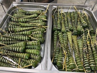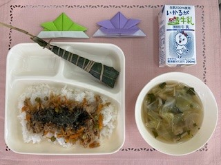 大阪市の給食では、こどもの日の行事献立に「ちまき」がつきます。ちまきは、もち米やうるち米、米粉などで作ったもちを笹(ささ)の葉で包み、蒸して作ります。中国から伝来したもので、「茅(ちがや)」の葉で包んでいたことから「茅(ちがや)巻き」と呼ばれていました。「こどもが元気に育ちますように」という願いが込められています。
