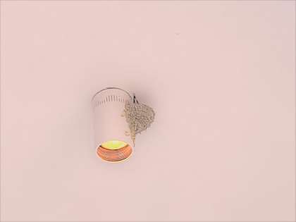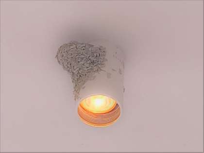 玄関ピロティ天井に作られた燕の巣。昨年作った巣をつがいの2羽がせっせと修繕しています。