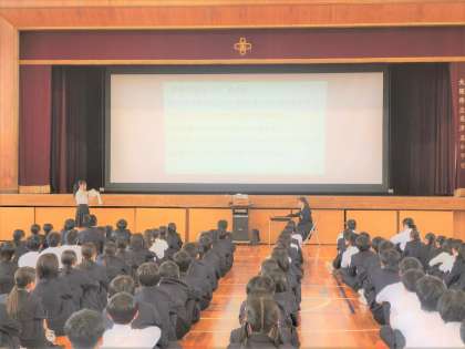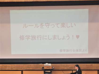 修学旅行実行委員会が、スライドを使ってルールについて、説明しました。ルールを守って楽しい修学旅行にしましょう。
