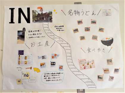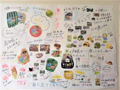 3年生の学年廊下には、修学旅行で訪れる高知県にまつわる食物や金毘羅山ふもとにあるお店などについて紹介したポスターを掲示しています。