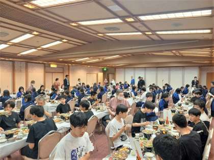 ソラカケルでは、時折雨が降りましたが、予定通りの活動を行いました。高知へ向かうバスの外は、あいにくのザーザー降りでしたが、予定通り宿舎に到着し、夕食を取っています。