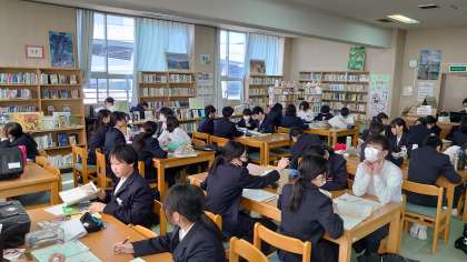 テスト前の自主学習会の様子です。今日は50人を超える生徒が図書室に来室。生徒同士で教え合いや提出物の確認をしています。