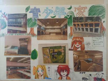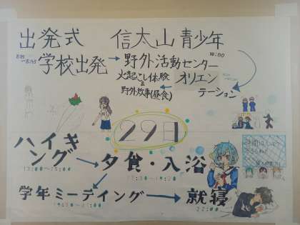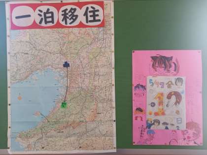 1年生は、29日から一泊移住に行きます。学年の廊下には、出発までの日数を示すカレンダーが掲示されています。ほかにも活動内容や施設の写真が貼り出されています。