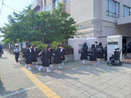 風紀委員が、クラスごと順番に正門付近であいさつ運動をしています。