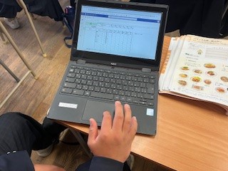 1、2枚目の写真は、家庭科2年生「バランスの良い献立作り」の学習で、子どもたちが1一人一台端末を使って献立を作っている様子です。