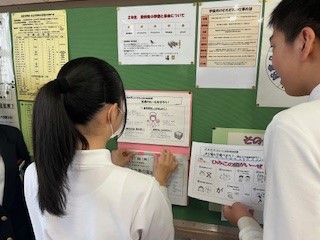 3枚目の写真は、保健・食育委員会の活動の一つ、給食カレンダーを掲示している様子です。