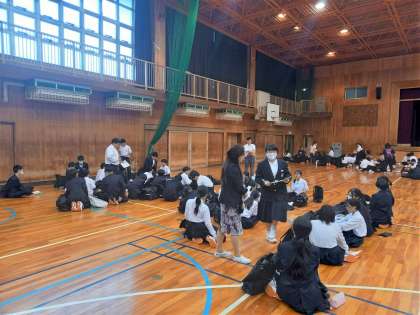 6時間目、1年生は体育館で一泊移住の事前指導を行いました。写真は、班長が班員の荷物に忘れ物がないかチェックしているところです。明日は、8時15分に集合です。