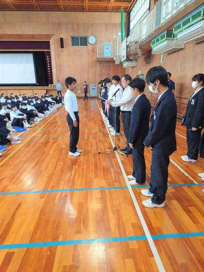 全校集会では、表彰状とメダルの授与が行われました。