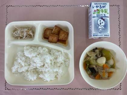 八宝菜は中国で「パーパオツァイ」といいます。「八」は数が多いことを意味し、よい材料をたくさん使って作った料理です。給食では、豚肉、うずら卵、キャベツ、たまねぎ、にんじん、たけのこ、ピーマン、しいたけを使っています。