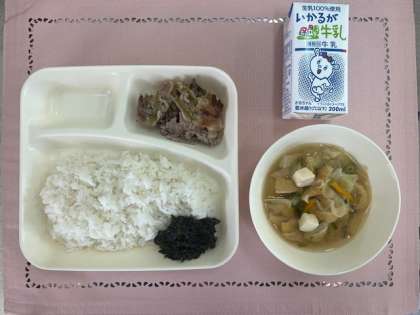 つくだ煮(に)は、大阪佃村(つくだむら)(現在の大阪市西淀川区佃(つくだ))で作られていた小魚を煮た保存食が始まりといわれています。つくだ煮は、小魚、こんぶ、貝などのいろいろな材料を塩、砂糖、しょうゆ、だし、しいたけなどと煮込んで作ります。今日の給食には、砂糖やこいくちしょうゆ、だし、しいたけを煮た中に、かつおぶしときざみのりを加えて煮つめた「のりのつくだ煮」が登場します。