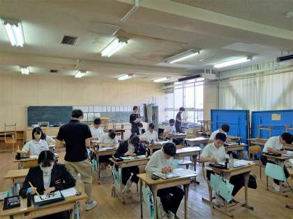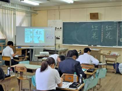 2年生では、クラスを分割して書写の授業を行っています。楷書と行書の違いを確認したのち「紅花」の文字を書きました。