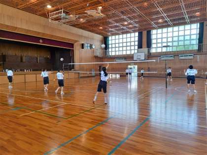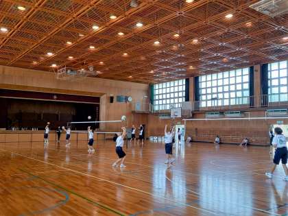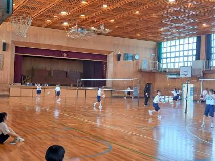 2年生女子は、体育館でバレーボールを行っています。今日は、オーバーハンドパスとアンダーハンドパス、サーブを練習しました。