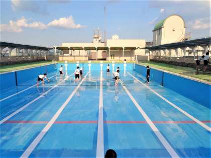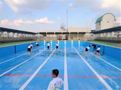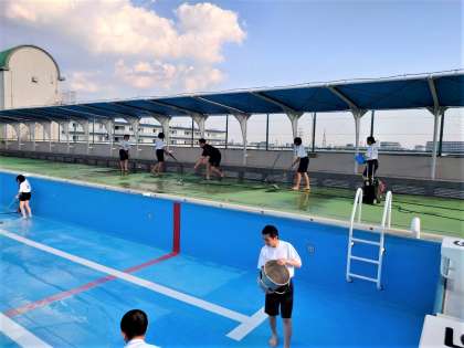 体育委員がプール清掃を行っています。プール槽だけでなくプールサイドの汚れもデッキブラシできれいに磨いてくれています。
