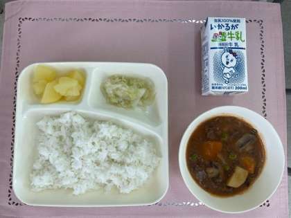 ハヤシライスは小麦粉とサラダ油などで「ブラウンルウ」を作り、とろみをつけています。大阪市の給食では、米を粉にして作られる米粉(上新粉)でとろみをつけています。