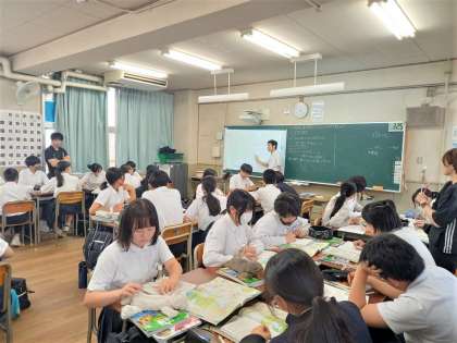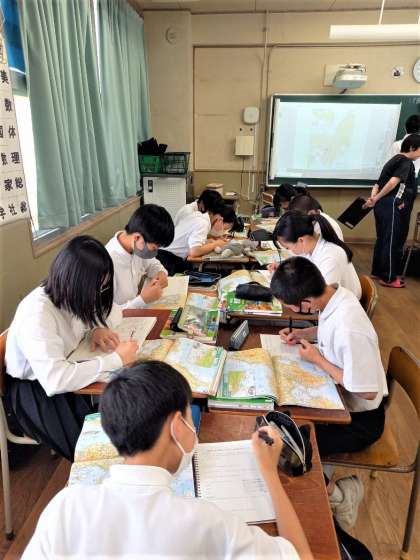 写真は、社会の授業の様子です。ニュータウンや都市の再開発について学習しました。