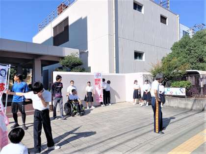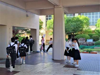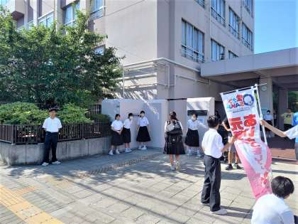 風紀委員が、学年ごとに分かれて「あいさつ運動」をしています。風紀委員の「おはようございます」の声が飛び交う中、登校する生徒もいつもより大きな声で「おはようございます」と返してくれる生徒が多いです。