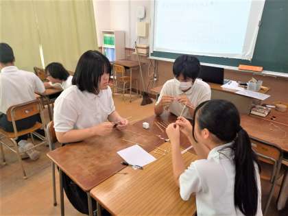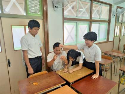 竹串とテープを使って、どれだけ高い位置に激落ちくんを持っていけるかをグループで試行錯誤しながらチャレンジしています。