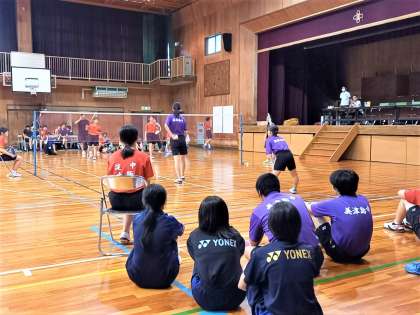 体育館では、バドミントン部が1ブロック大会(団体)に臨んでいます。