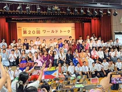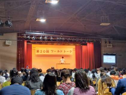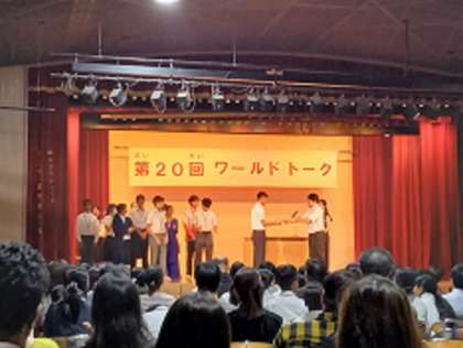 住吉中学校で、第20回ワールドトークが行われました。ワールドトークとは、大阪市内の中学校に通う来日生徒が集まり、普段学んでいる日本語教室ごとに自分のことについて母語で発表する取り組みです。美津島中学校からも3年生の生徒が参加し、大勢の人の前で日本に来て思ったことについて話してくれました。