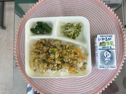 他人丼(たにんどんぶり)は、鶏肉(けいにく)以外の肉(牛肉や豚肉など)とたまねぎを甘辛(あまから)く煮て、卵でとじてご飯の上にのせた料理です。鶏肉と卵が親子の関係の「親子丼(おやこどんぶり)」に対し、牛肉や豚(ぶた)肉(にく)などと卵は他人の関係なので「他人丼」と名付けられたといわれています。