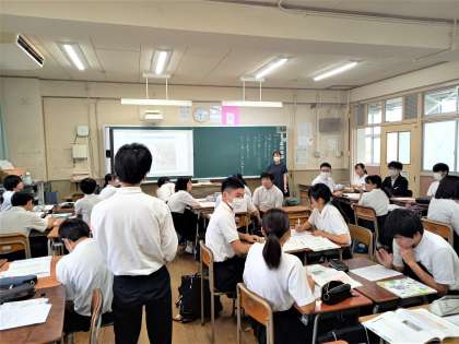 1限目は、道徳の授業でした。今日の道徳は「ベビーカー論争」についてでした。生徒からは「思いやりの心や相手を尊重することが必要」や「男性がもっと育児に参加すれば、社会を変えることができるのでは?」といった意見が出ていました。