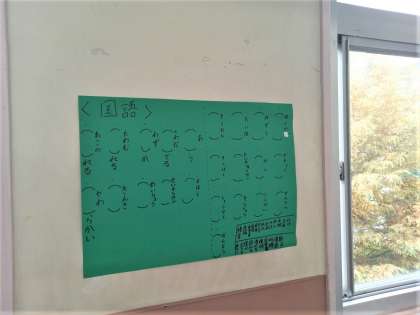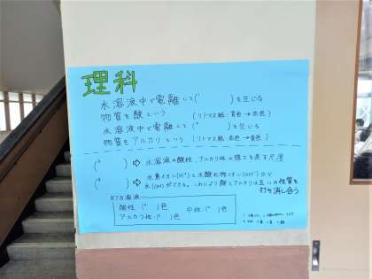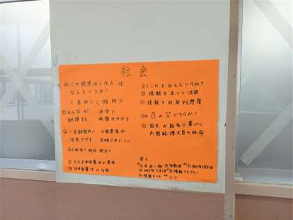 今週末のテストに向けて、3年生の学年廊下には、生徒が作成した予想テスト問題が貼られています。