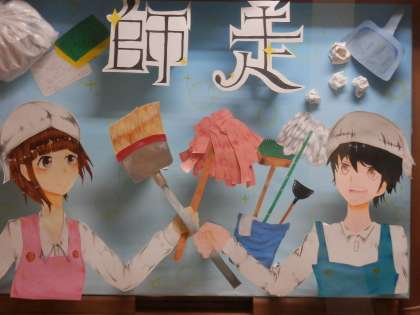「大そうじ」のディスプレイは「清潔感」が出るように背景をさわやかな色合いにし、シンプルにしました。また、インパクトを重視し、より立体的に仕上げました。苦労したところは、小物のつや、服のしわ、そして文字のレタリングです。テストに追われながらも頑張りました。