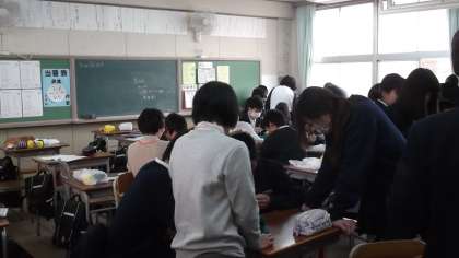 2年生—2年生も先週に引き続き修学旅行で使用する手編みの帽子の作成(2回目)を行いました。本日も地域の方7名に講師として参加していただきました。