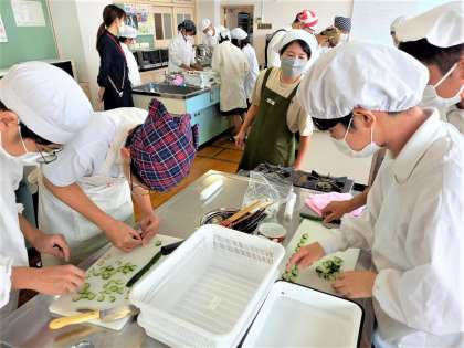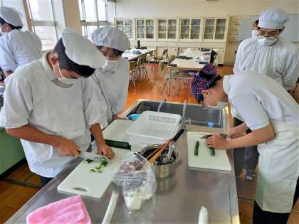 2年生の家庭科では、きゅうりの輪切りのテストが行われています。元気アップボランティアの方々や学びサポーターの方にも手伝ってもらっています。切ったきゅうりは、テスト終了後、みんなでおいしくいただきました。