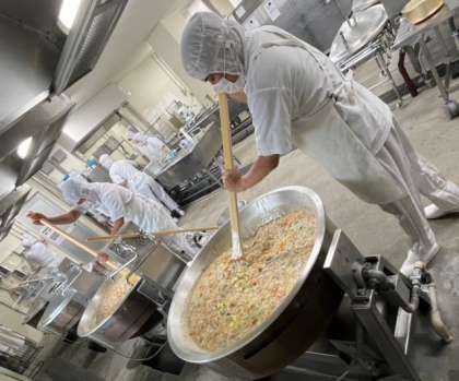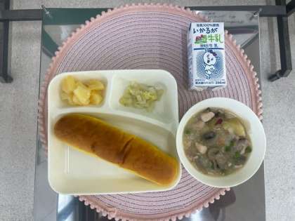 食べ物には、栄養価が高く、たくさんとれて、おいしく食べられる時期(旬(しゅん))があります。秋が旬の食べ物には「さんま」「くり」「さつまいも」「ぶどう」「きのこ」「さといも」「かき」「なし」などがあります。今日の給食には、さつまいもが使われています。