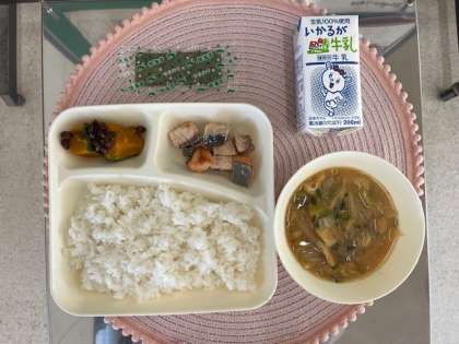 いとこ煮(に)とは、野菜や豆を煮る時に「追い追い(甥(おい)、甥(おい))煮(に)る」ことから、甥同士はいとこのため「いとこ煮」と呼ばれるようになったといわれています。また、かぼちゃも小豆も長い間保存ができ栄養価も高いことから、かぜをひかずに冬を乗り切るための郷土料理として親しまれています。*追い追い・・・「順(じゅん)を追って」、「だんだんに」という意味です。今日は、かぼちゃとあずきを使っています。