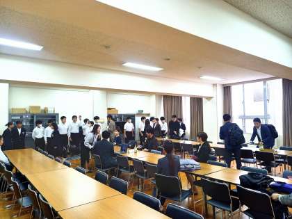 6時間目2年生は、課題解決学習の取り組みを行いました。今回は、課題を提供してくれる企業の方々から、各企業の紹介や課題設定の理由などについて説明がありました。生徒は、メモをとりながら真剣な面持ちで話を聞いていました。写真は各グループの代表者が、大会議室に企業の方々を迎えに来ている様子です。