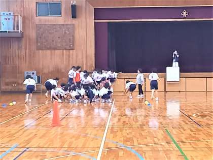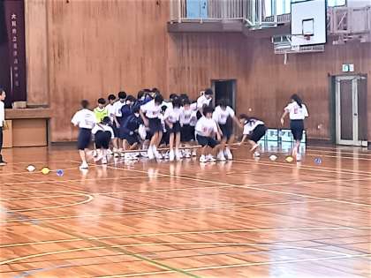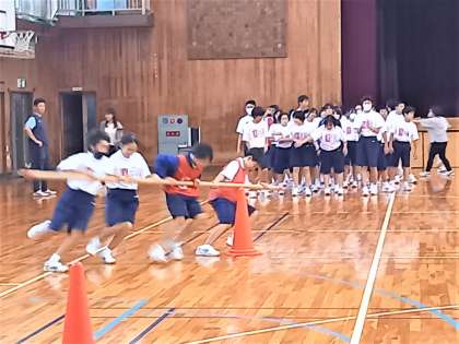 1年生は、雨のため体育館で学年競技の「台風の目」をトーナメント方式で対戦しました。
