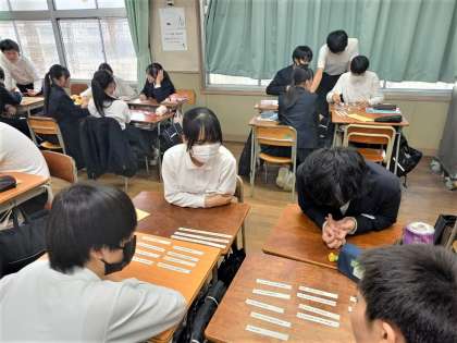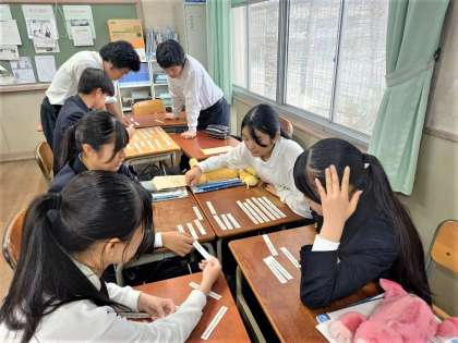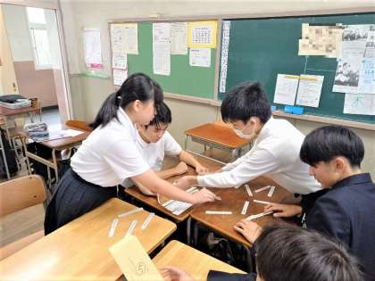 3年生英語の授業の様子です。紙に書かれた1つの文章のA前半とB後半を、相談しあいながら意味の通る文章にしています。