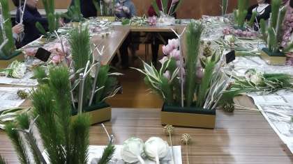 本日、15:00〜 本校中会議室にてPTA成人委員会主催のアレンジメントフラワー教室が開催され、多くの方が参加されました。『若松』『銀竹』『シンビジューム』『葉ボタン』『サンデリアーナ』『松笠』『千両』