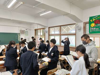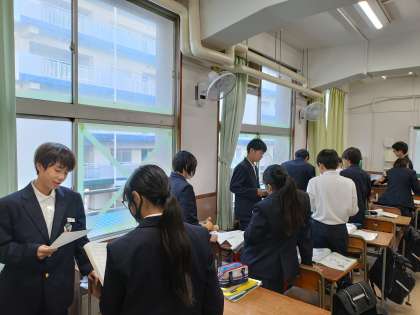 今日は「What is wrong?」など体調が悪い時の言い方について学習しました。体の部分にacheをつけることで、「…痛」という意味になることも学習しました。写真は、ペアで「What is wrong?」「I have 〇〇ache」の会話文を練習しています。