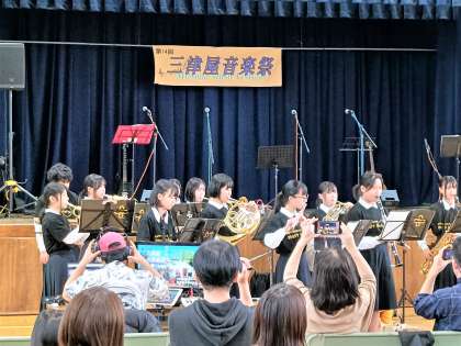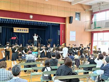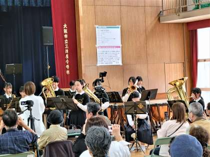 吹奏楽部が、三津屋地域で開催されている「三津屋音楽祭」のオープニング演奏を行いました。雨が心配されていたので、阪急神崎川駅前の阪急オアシス前の広場から急遽、三津屋小学校に場所を変更しての演奏となりました。1・2年生だけでの演奏にも慣れてきて、オープニング演奏にふさわしい元気のある演奏でした。