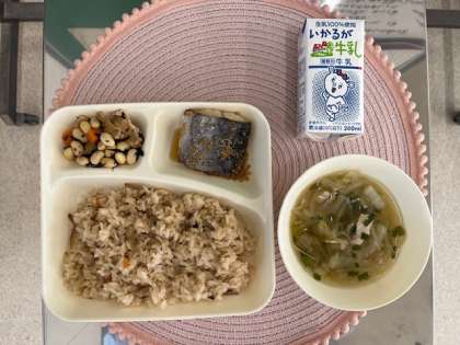 だしは、食品に含まれる「うま味」の成分を水で煮出(にだ)したもので、和食には欠かせないものです。こんぶとかつおぶしなど、異なる材料でとっただしを合わせると、一種類だけの時よりもうま味が強くなります。今日の給食のすまし汁と大豆の煮ものには、さばぶしとにぼしの混合けずりぶしと、こんぶでとっただしを使用しています。