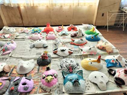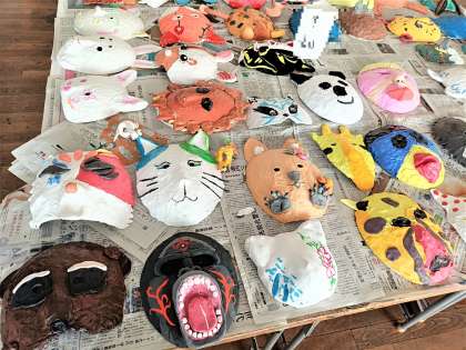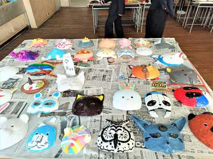 1年生の美術では、動物をテーマにお面作りに取り組んできました。美術室には、力作が並んでいます。