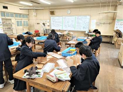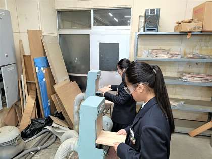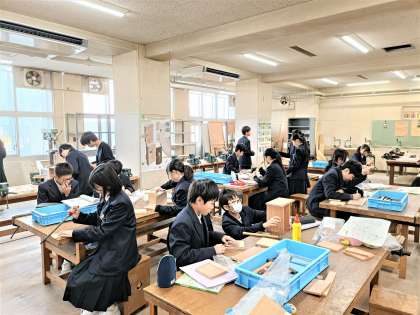 1年生の技術では、木材加工の授業で本棚や小物入れなどを作っています。