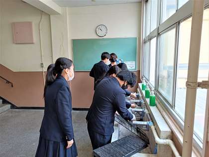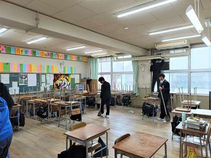 3年生の大掃除の様子です。手洗い場では、エアコンのフィルターの埃をきれいに洗い流しています。